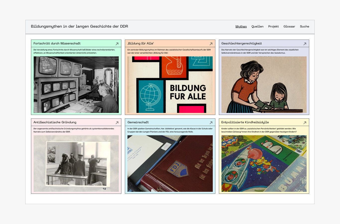 Eine weitere Anforderung an die Website bildungsmythen-ddr.de war, dass sie so barrierearm wie möglich sein sollte. Daher haben wir zum einen ein Design entwickelt, das sehr gut lesbar ist und einen starken Kontrast bietet. Die sechs Farben, die neben Schwarz verwendet werden, sind Pastelltöne, die einen sehr starken Kontrast zum Text bieten und deren Erkennung für das Verständnis des Inhalts nicht unbedingt erforderlich ist. Die Website ist so aufgebaut, dass sie bei Bedarf vergrößert und/oder mit einem Screenreader gelesen werden kann. Jedes Video verfügt über einschaltbare Untertitel und eine vollständige Transkription in Form einer barrierefreien PDF. Die Interviews, die im Rahmen der Forschungsprojekte geführt wurden, sind ebenfalls als barrierefreie PDF verfügbar.