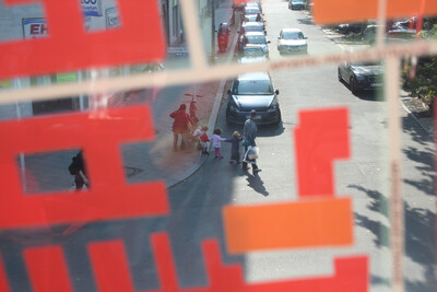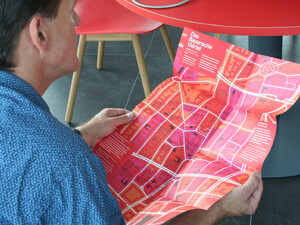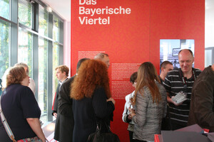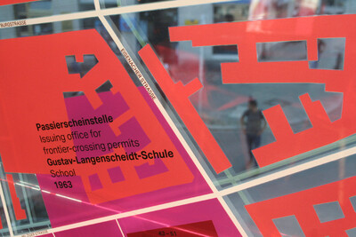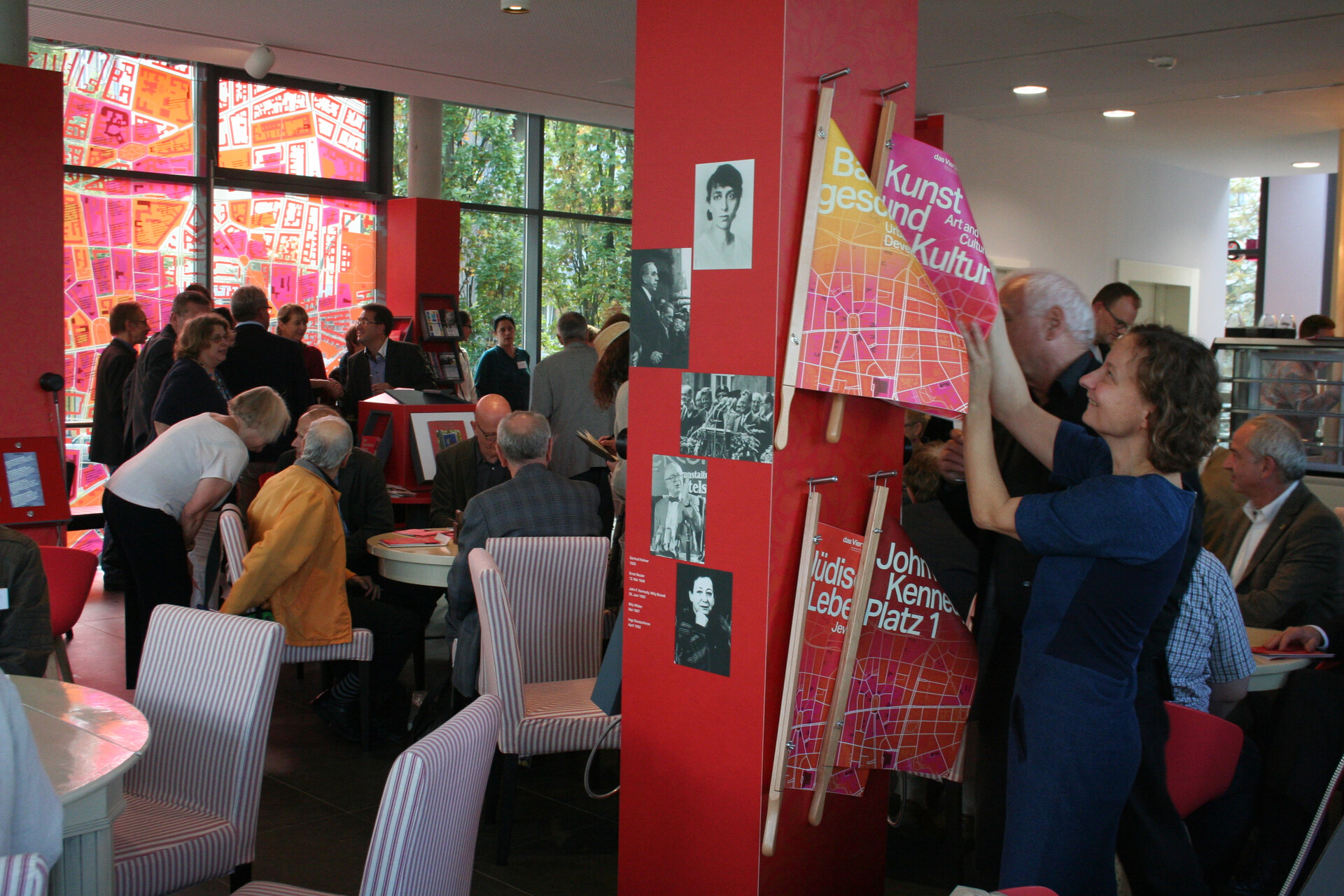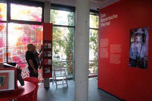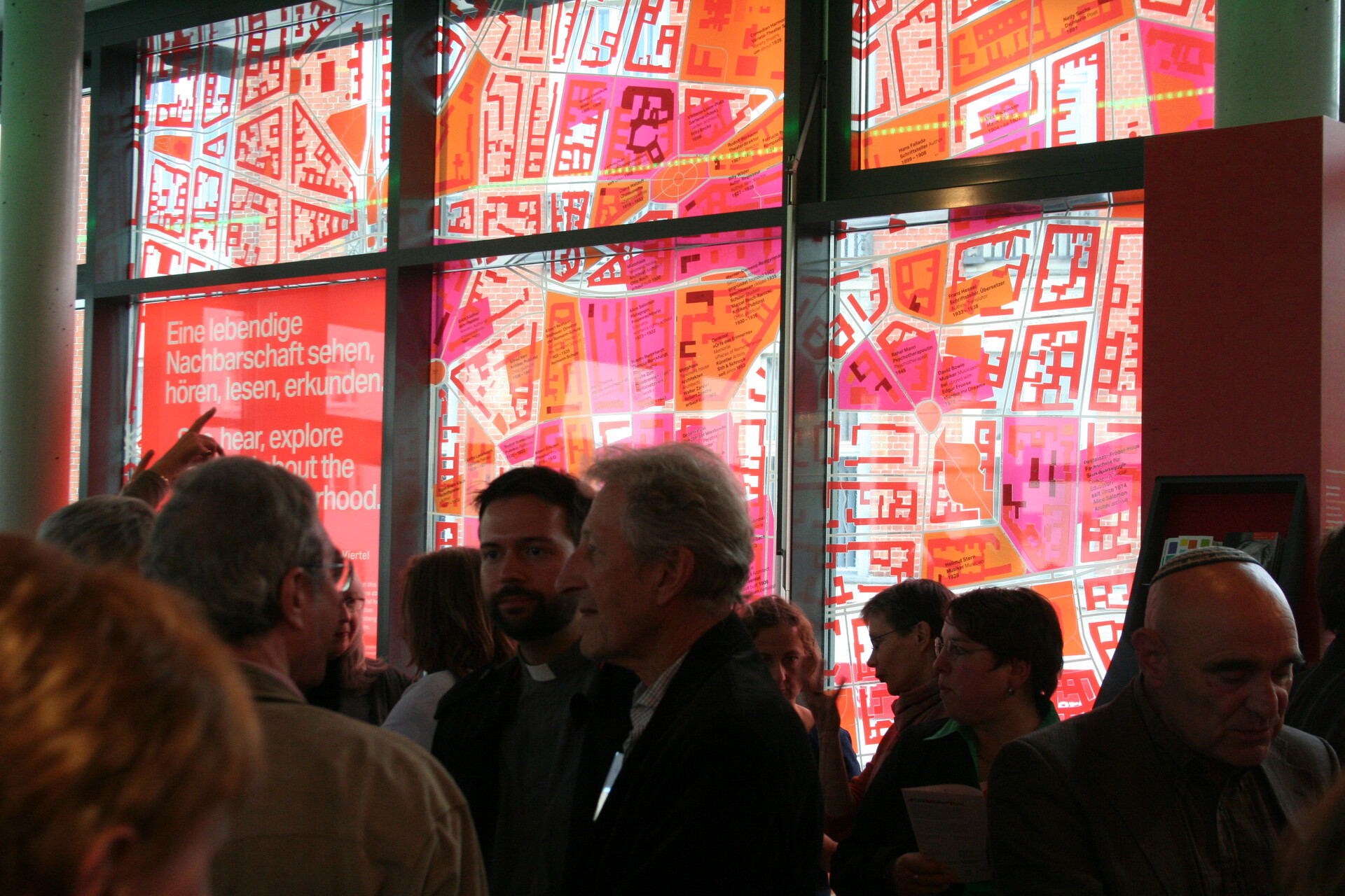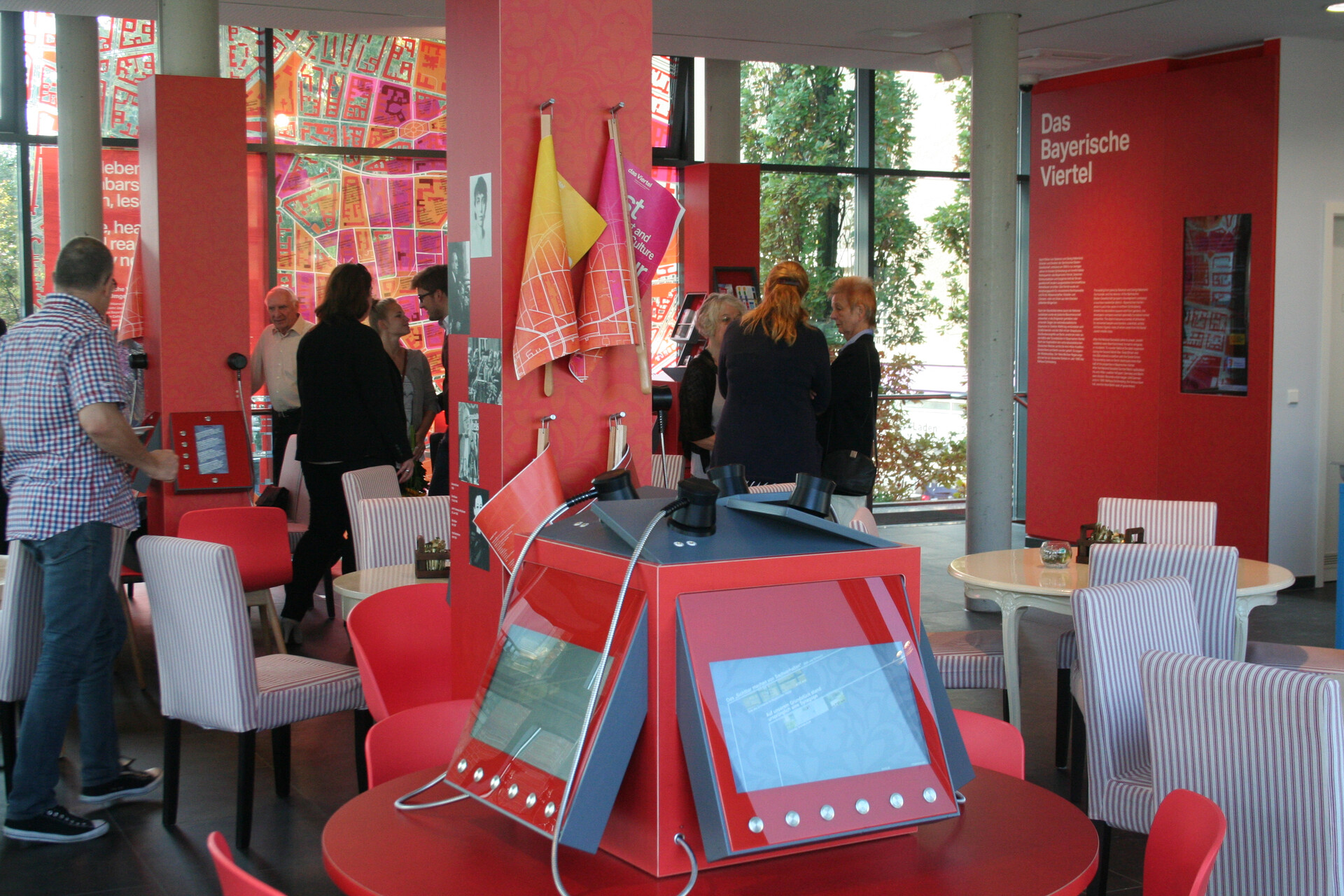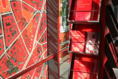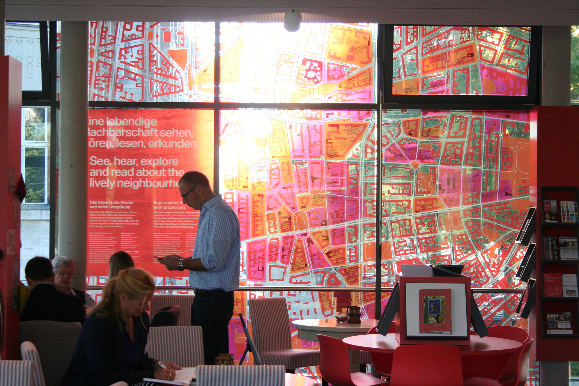 Unsere Ausstellungsgestaltung setzt auf Klarheit und Offenheit. Eine reduzierte Farbgebung und moderne Typografie schaffen Orientierung, ohne sich in den Vordergrund zu drängen. Herzstück ist die über 20 Quadratmeter große Stadtplangrafik an der südlichen Glasfassade: Sie öffnet den Blick ins Viertel und taucht das Café bei Sonneneinfall in einen warmen, beinahe mediterranen Ton. Information wird hier Teil der Atmosphäre.