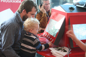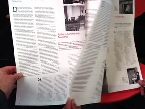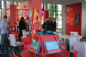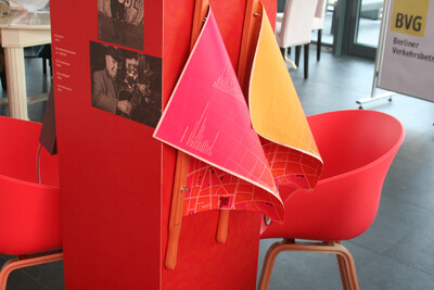 Leitend für unsere Gestaltung war eine einfache, zugleich weitreichende Frage: Was tun Menschen heute im Café? Viele lesen noch immer Zeitung. An ihre Stelle treten im Café Haberland Geschichtsmagazine im Format von Tageszeitungen. Medienstationen mit Kopfhörern, Hörstücken und einem kleinen Filmarchiv knüpfen an heutige Gewohnheiten an – Smartphone und Laptop sind längst selbstverständliche Begleiter.