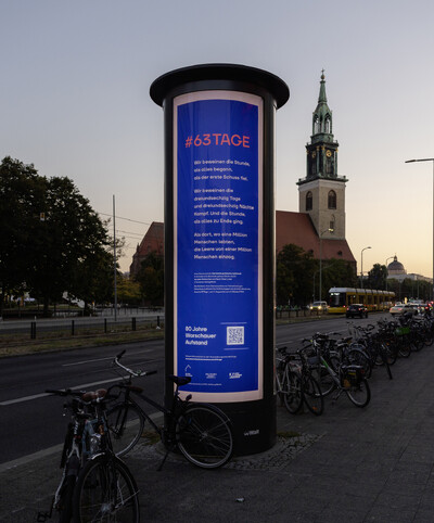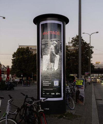 Anlässlich des 80. Jahrestags wird über den Aufstand informiert und der Opfer der polnischen Zivilbevölkerung gedacht. Gedichttexte im öffentlichen Raum und das zentrale Bildmotiv einer Warschauerin, die gemeinsam mit anderen Barrikaden errichtet, verankern die Thematik im Berliner Stadtbild. Das Erscheinungsbild dieser Reihe haben wir in enger Zusammenarbeit mit den Beteiligten entwickelt.