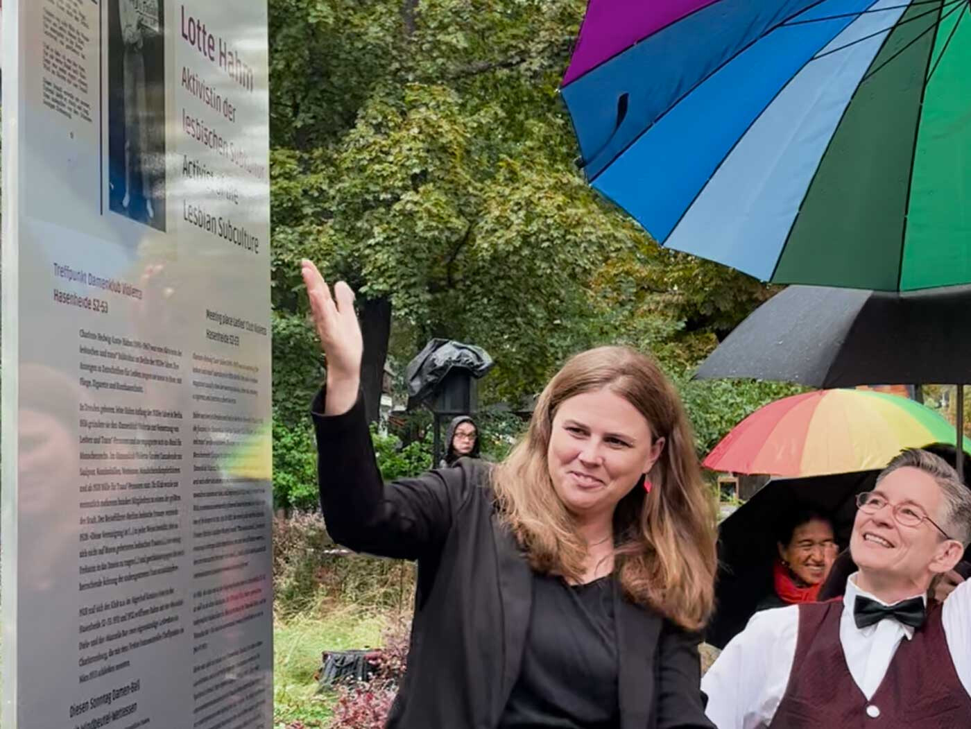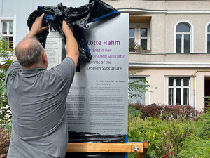 Eine weitere Stele ehrt Charlotte Hedwig „Lotte“ Hahm, die in der Weimarer Republik Treffpunkte für Lesben und Trans*-Personen schuf, mutig und beharrlich in einer Zeit, die ihre Subkultur bedrohte. Ihre Arbeit vernetzte, stärkte und gab Raum – selbst im Schatten des Nationalsozialismus gelang es ihr, Begegnungen zu ermöglichen, die Hoffnung und Widerstand zugleich waren.
