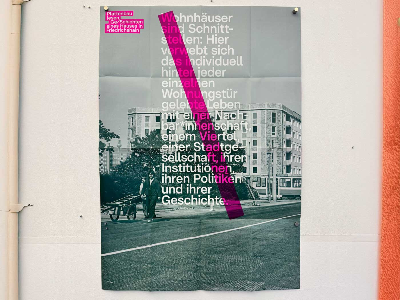 Das Broschüren-Plakat »Plattenbau lesen« öffnet ein Fenster in die Marchlewskistraße in Friedrichshain. 1984 eingeweiht, schwärmte eine Erstbewohnerin: „Ein Traum. Warmwasser, Zentralheizung.“ Doch hinter jeder Wohnungstür schlummern Geschichten – vom Alltag, von Nachbarschaften, vom Puls der Stadtgesellschaft.