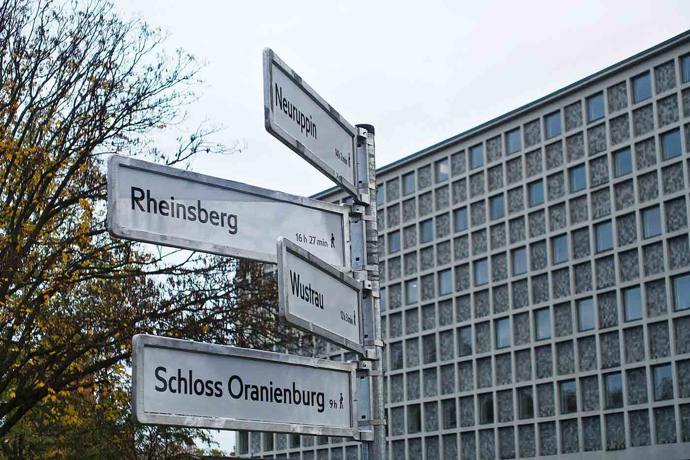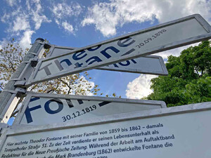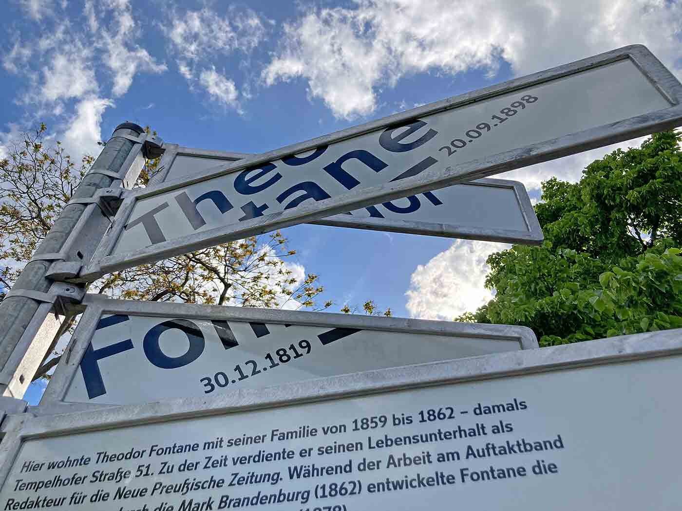 Erinnerung an Fontane. Ein Beispiel ist das Gedenkzeichen für Theodor Fontane. In der Tempelhofer Straße 51 – heute Amerika-Gedenkbibliothek – lebte und arbeitete er, zwischen Kerzenlicht und Zeitungspapier. Wir kombinierten Alurahmen und Straßenschilder-Typografie, doch statt Straßennamen finden sich Orte der Mark Brandenburg aus seinem Werk.