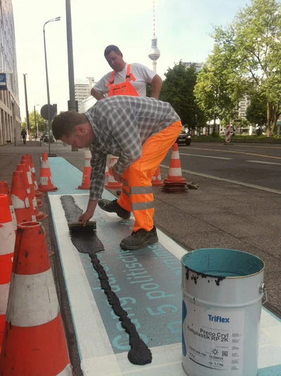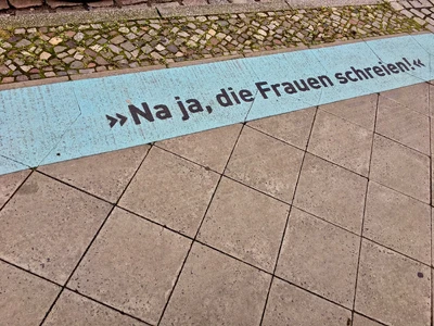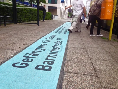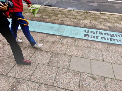 Manchmal ist Erinnerung versteckt zwischen Plattenbauten und Flieder. Das Gelände des ehemaligen Frauengefängnisses Barnimstraße ist heute kaum sichtbar. Blaue Markierungen auf dem Trottoir machen den Weg lesbar: Sie führen Passant·innen vom Alexanderplatz zum Gedenkort und verankern Geschichte dauerhaft im Stadtraum.