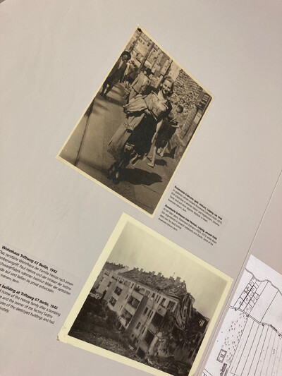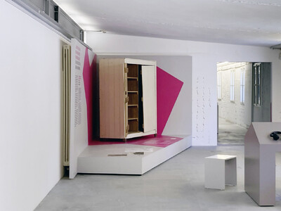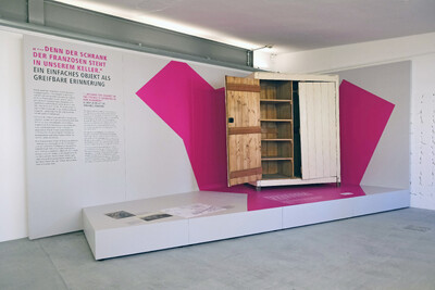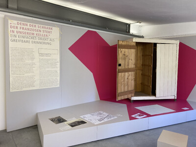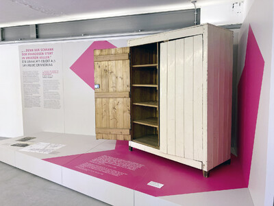 Auftakt der Präsentation war ein Holzschrank, zwischen 1940 und 1945 von französischen Zwangsarbeitern für die Familie Erdmann in Berlin gefertigt. Rosemarie Erdmann, Zeitzeugin und Bewahrerin des Schranks, hat ihre Erlebnisse niedergeschrieben. Mit Auszügen aus ihren Berichten und einer Kurzbiografie ist sie Teil unserer Dauerausstellung. Ein gezielt gesetzter Farbakzent lenkt den Blick auf das Objekt und hebt seine besondere Geschichte hervor.