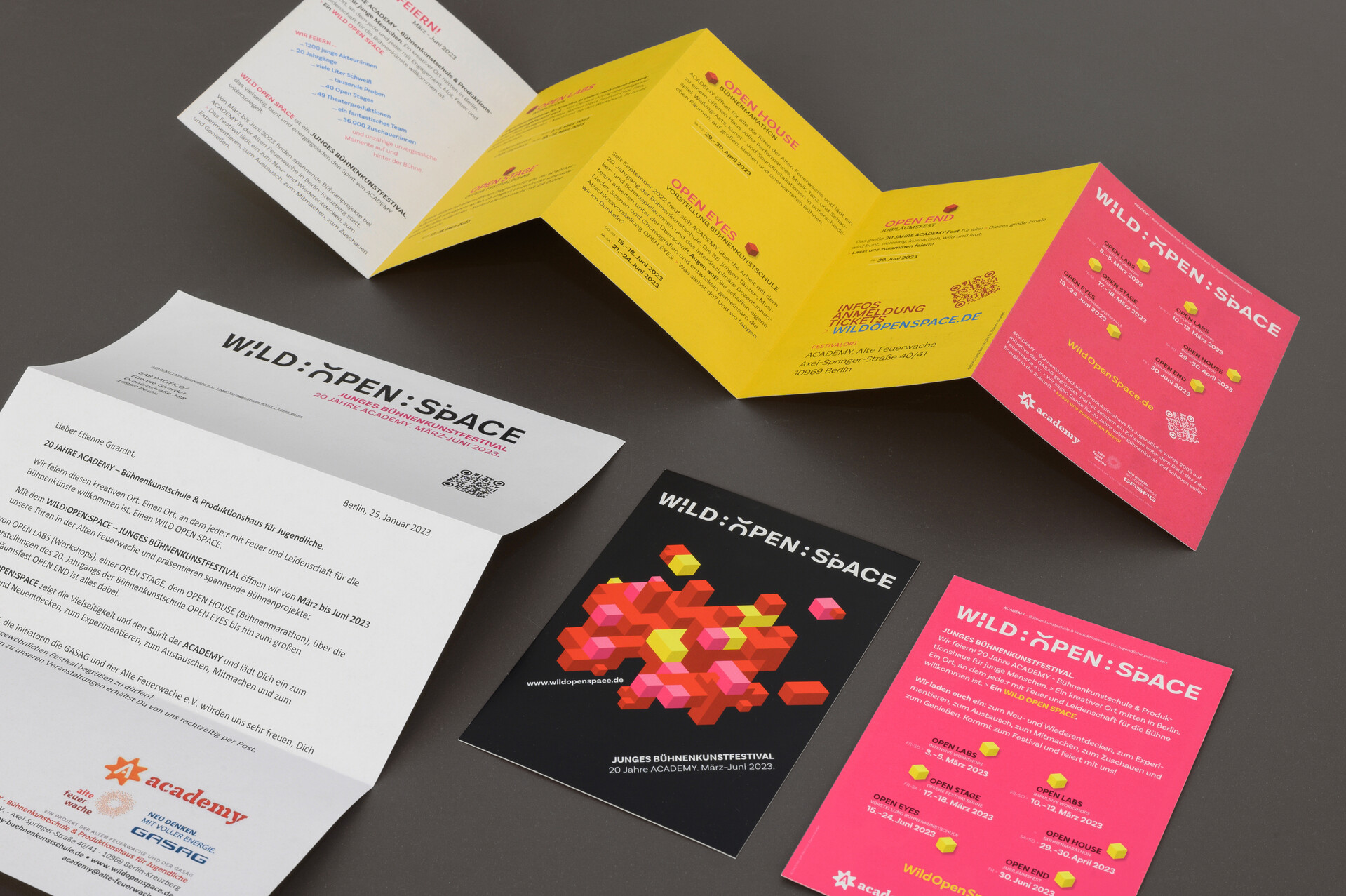In einem gemeinsamen kreativen Prozess mit der Bühnenkunstschule entwickeln wir Plakate, Postkarten, Programmhefte und Eintrittskarten für die Vorstellungen des Jahres. Mit einer von uns gestalteten Website präsentiert sich ACADEMY im Netz, hier gibt es auch ein Online-Casting-Formular, ein Reservierungssystem für die Tickets der Theater-Vorstellungen und andere Web-Angebote. Die Inhalte pflegt das Team von ACADEMY nach einem kurzen Workshop im Redaktionssystem selbst. Außerdem entwerfen und produzieren wir Goodies wie Taschen, Schlüsselanhänger und T-Shirts.