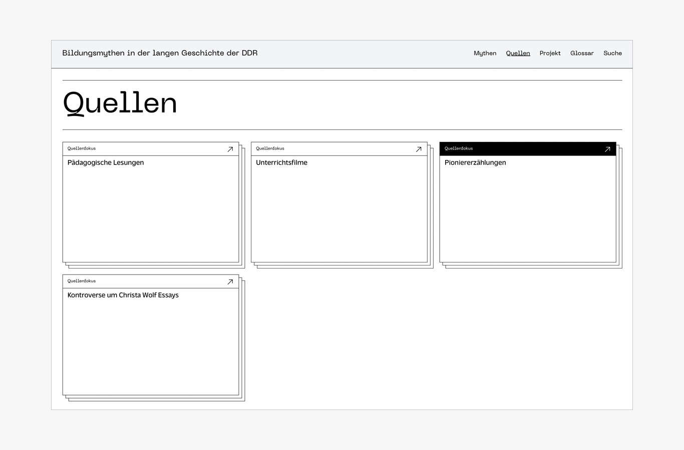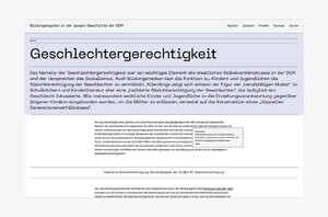 Eine weitere Anforderung an die Website bildungsmythen-ddr.de war, dass sie so barrierearm wie möglich sein sollte. Daher haben wir zum einen ein Design entwickelt, das sehr gut lesbar ist und einen starken Kontrast bietet. Die sechs Farben, die neben Schwarz verwendet werden, sind Pastelltöne, die einen sehr starken Kontrast zum Text bieten und deren Erkennung für das Verständnis des Inhalts nicht unbedingt erforderlich ist. Die Website ist so aufgebaut, dass sie bei Bedarf vergrößert und/oder mit einem Screenreader gelesen werden kann. Jedes Video verfügt über einschaltbare Untertitel und eine vollständige Transkription in Form einer barrierefreien PDF. Die Interviews, die im Rahmen der Forschungsprojekte geführt wurden, sind ebenfalls als barrierefreie PDF verfügbar.